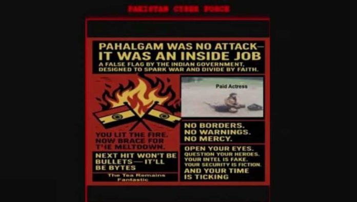 പഹൽഗാമിൽ നടന്നത് ഭീകരാക്രമമല്ല, വിശ്വാസത്തിന്റെ അടിസ്ഥാനത്തിൽ ജനങ്ങളെ ഭിന്നിപ്പിക്കാനും പ്രകോപിപ്പിച്ചു യുദ്ധം ഉണ്ടാക്കാനുമുള്ള ഇന്ത്യാ ഗവൺമെന്റിന്റെ ഓപ്പറേഷൻ ആയിരുന്നെന്നും പോസ്റ്ററിൽ പറയുന്നു. ‘നിങ്ങളാണ് യുദ്ധം തുടങ്ങിയത്, അടുത്ത പോരാട്ടം വെടിയുണ്ട കൊണ്ടായിരിക്കില്ല.മരിച് ഡിജിറ്റൽ യുദ്ധമായിരിക്കും. മുന്നറിയിപ്പോ ദയയോ പ്രതീക്ഷിക്കേണ്ട.നിങ്ങൾ കണ്ണ് തുറന്ന് നിങ്ങളെ നായകന്മാരെ ചോദ്യംചെയ്യുക. നിങ്ങളുടെ ഇന്റലിജൻസ് ഏജൻസികൾ വ്യാജമാണ്. നിങ്ങളുടെ സുരക്ഷ മിഥ്യയാണ്.കൗണ്ട്ഡൗൺ തുടങ്ങി കഴിഞ്ഞു.” ഇതായിരുന്നു പോസ്റ്ററിൽ ഉള്ളടക്കം.