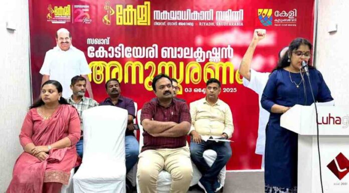 റിയാദ് : സിപിഐഎം പോളിറ്റ് ബ്യൂറോ അംഗവും സംസ്ഥാന സെക്രട്ടറിയും അഭ്യന്തന്തര മന്ത്രിയുമായിരുന്ന കോടിയേരി ബാലകൃഷ്ണൻറെ മൂന്നാമത് അനുസ്മരണ ദിനം ആചരിച്ച് കേളി കലാസാംസ്കാരിക വേദി. ബത്ത ലൂഹ ഓഡിറ്റോറിയത്തിൽ നടന്ന പരിപാടിയിൽ രക്ഷാധികാരി സെക്രട്ടറി കെപിഎം സാദിഖ് അധ്യക്ഷത വഹിച്ചു. കേളി കുടുംബവേദി സെക്രട്ടറിയും രക്ഷാധികാരി സമിതി അംഗവുമായ സീബ കൂവോട് അനുസ്മരണ കുറിപ്പ് അവതരിപ്പിച്ചു.