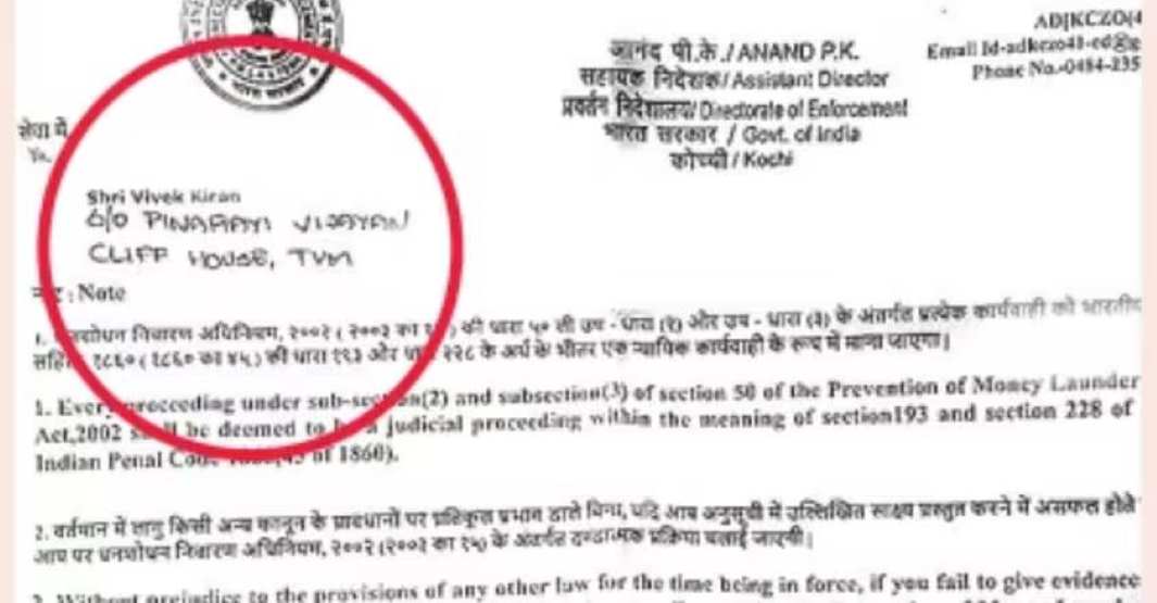 തിരുവനന്തപുരം: ലൈഫ് മിഷൻ വിവാദത്തിലെ കള്ളപ്പണം വെളുപ്പിക്കലുമായി ബന്ധപ്പെട്ട് മുഖ്യമന്ത്രിയുടെ മകൻ വിവേക് കിരണിന് എൻഫോഴ്‌സ്‌മെന്റ് ഡയറക്ടറേറ്റ് സമൻസ് അയച്ചതിൻറെ സമൻസ് പുറത്ത്. ക്ലിഫ് ഹൗസ് വിലാസത്തിലാണ് സമൻസ് അയച്ചത്.