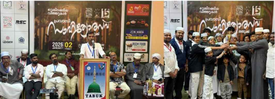 തബൂക്ക്: ആർ.എസ്.സി (രിസാല സ്റ്റഡി സർക്കിൾ) കലാലയം സാംസ്കാരിക വേദിയുടെ കീഴിൽ പതിനഞ്ചാമത് എഡിഷൻ സാഹിത്യോത്സവ് തബൂക്കിൽ സംഘടിപ്പിച്ചു. 2026 ജനുവരി 2 വെള്ളിയാഴ്ച നടന്ന സാഹിത്യോത്സവത്തിൽ വിവിധ ഇനങ്ങളിലായി വിദ്യാർഥികൾ ആവേശകരമായി മാറ്റുരച്ചു. മത്സരങ്ങളിൽ മുറൂജ് സെക്ടർ ജേതാക്കളായപ്പോൾ ശാരലാം സെക്ടർ രണ്ടാം സ്ഥാനം നേടി.
