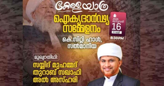 മനാമ: സമസ്ത കേരള ജംഇയ്യത്തുൽ ഉലമ സെന്റിനറിയുടെ ഭാഗമായി കേരള മുസ്ലിം ജമാഅത്തിന്റെ നേതൃത്വത്തിൽ നടക്കുന്ന കേരള യാത്രയോടനുബന്ധിച്ച് ഐ.സി എഫ് ബഹ്റൈൻ സംഘടിപ്പിക്കുന്ന ഐക്യദാർഢ്യ സമ്മേളനം ജനുവരി 16 വെള്ളി രാത്രി എട്ടിന് സൽമാനിയ കെ. സിറ്റി ഹാളിൽ നടക്കും. കേരള മുസ്ലിം ജമാഅത്ത് സാരഥിയും മർകസ് ഉപാദ്ധ്യക്ഷനുമായ സയ്യിദ് മുഹമ്മദ് തുറാബ് സഖാഫി അൽ അസ്ഹരി സമ്മേളനത്തിൽ മുഖ്യാതിഥിയാവും.