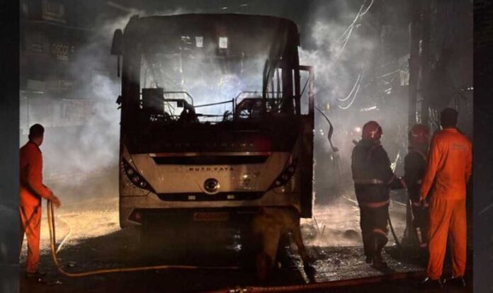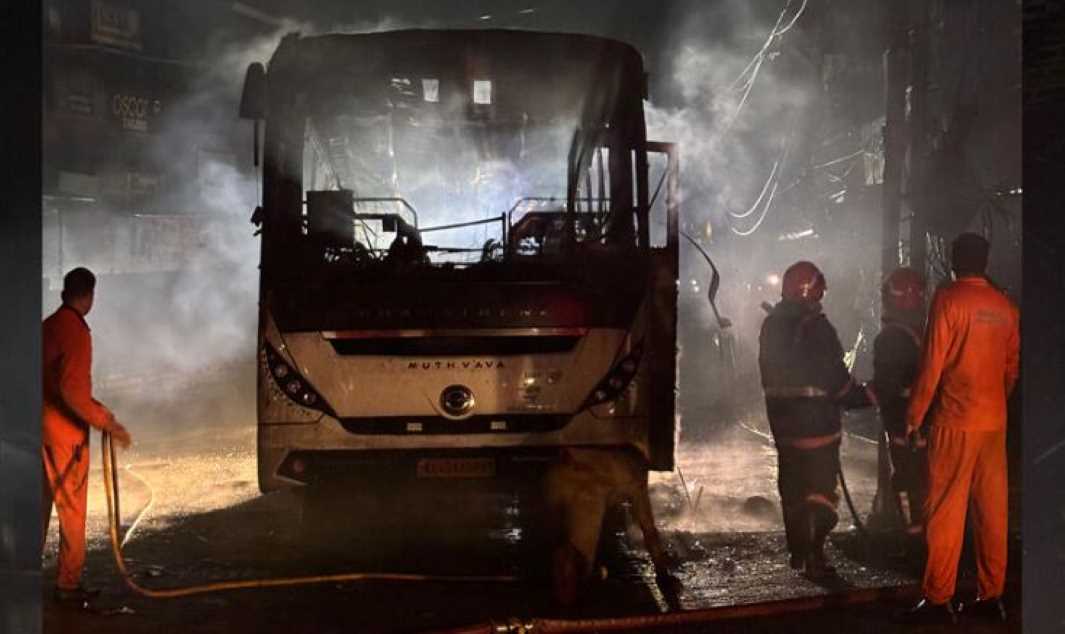 കോട്ടയം: മധുരയിൽ നിന്ന് എറണാകുളത്തേക്ക് വരികയായിരുന്ന ടൂറിസ്റ്റ് ബസ് മുണ്ടക്കയം ടൗണിൽ വെച്ച് പൂർണ്ണമായും കത്തിനശിച്ചു. ചൊവ്വാഴ്ച പുലർച്ചെ നാല് മണിയോടെയായിരുന്നു സംഭവം. കോട്ടയം സ്വദേശികളുടെ ഉടമസ്ഥതയിലുള്ള ‘മോക്ഷ’ എന്ന ബസിനാണ് തീപിടിച്ചത്. യാത്രയ്ക്കിടെ ബസിനുള്ളിൽ നിന്ന് പുക ഉയരുന്നത് ശ്രദ്ധയിൽപ്പെട്ട ഡ്രൈവർ ഉടൻ തന്നെ വാഹനം മുണ്ടക്കയം ടൗണിൽ നിർത്തുകയും യാത്രക്കാരെ പുറത്തിറക്കുകയും ചെയ്തതിനാൽ വൻ ദുരന്തം ഒഴിവായി. 45 യാത്രക്കാരാണ് അപകടസമയത്ത് ബസിലുണ്ടായിരുന്നത്.