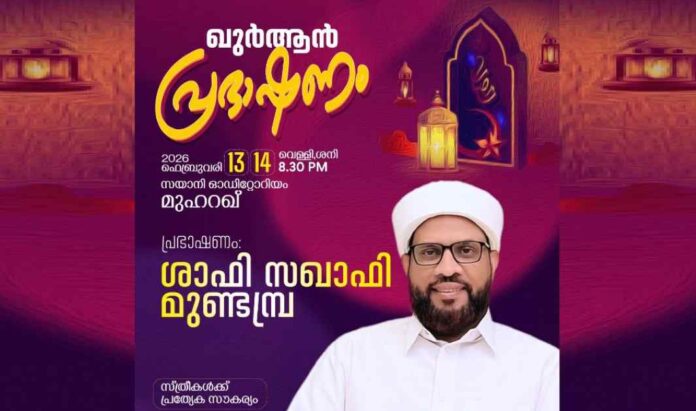 മനാമ: ഐ.സി.എഫ് ബഹ്റൈൻ സംഘടിപ്പിക്കുന്ന ദ്വിദിന ഖുർആൻ പ്രഭാഷണത്തിന് വെള്ളിയാഴ്ച രാത്രി എട്ട് മണിക്ക് തുടക്കമാകും. വെളളി,ശനി ദിവസങ്ങളിലായി മുഹറഖ് സയാനി ഓഡിറ്റോറിയത്തിൽ സമസ്ത കേരള ജംഇയ്യത്തുൽ ഉലമ ഉപാദ്ധ്യക്ഷൻ സയ്യിദ് അലി ബാഫഖി തങ്ങളുടെ പ്രാർഥനയോടെ ആരംഭിക്കുന്ന പരിപാടിയിൽ കേരളത്തിലെ അറിയപ്പെടുന്ന പണ്ഡിതനും പ്രഭാഷകനുമായ ശാഫി സഖാഫി മുണ്ടമ്പ്ര ഖുർആൻ പ്രഭാഷണം നടത്തും.