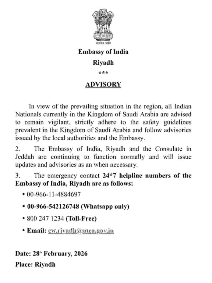 റിയാദ്: മേഖലയിലെ നിലവിലെ സാഹചര്യം കണക്കിലെടുത്ത് സൗദി അറേബ്യയിലുള്ള ഇന്ത്യൻ പൗരന്മാർ ജാഗ്രത പാലിക്കണമെന്ന് റിയാദിലെ ഇന്ത്യൻ എംബസി അറിയിച്ചു. 2026 ഫെബ്രുവരി 28-ന് പുറത്തിറക്കിയ പ്രത്യേക നിർദ്ദേശത്തിലാണ് എംബസി ഇക്കാര്യം വ്യക്തമാക്കിയത്.