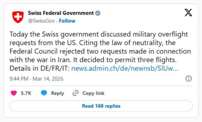 ഇറാനിലെ യുദ്ധവുമായി ബന്ധപ്പെട്ട സൈനിക നീക്കങ്ങൾക്കായി സ്വിസ് വ്യോമാതിർത്തി വിട്ടുനൽകില്ലെന്ന് അധികൃതർ വ്യക്തമാക്കി. ആഗോള സംഘർഷങ്ങളിൽ ഒരുപക്ഷത്തും ചേരാതെ മാറിനിൽക്കുന്ന തങ്ങളുടെ നയതന്ത്ര പാരമ്പര്യം തുടരുന്നതിന്റെ ഭാഗമായാണ് ഈ നടപടിയെന്ന് സ്വിസ് ഭരണകൂടം അറിയിച്ചു.